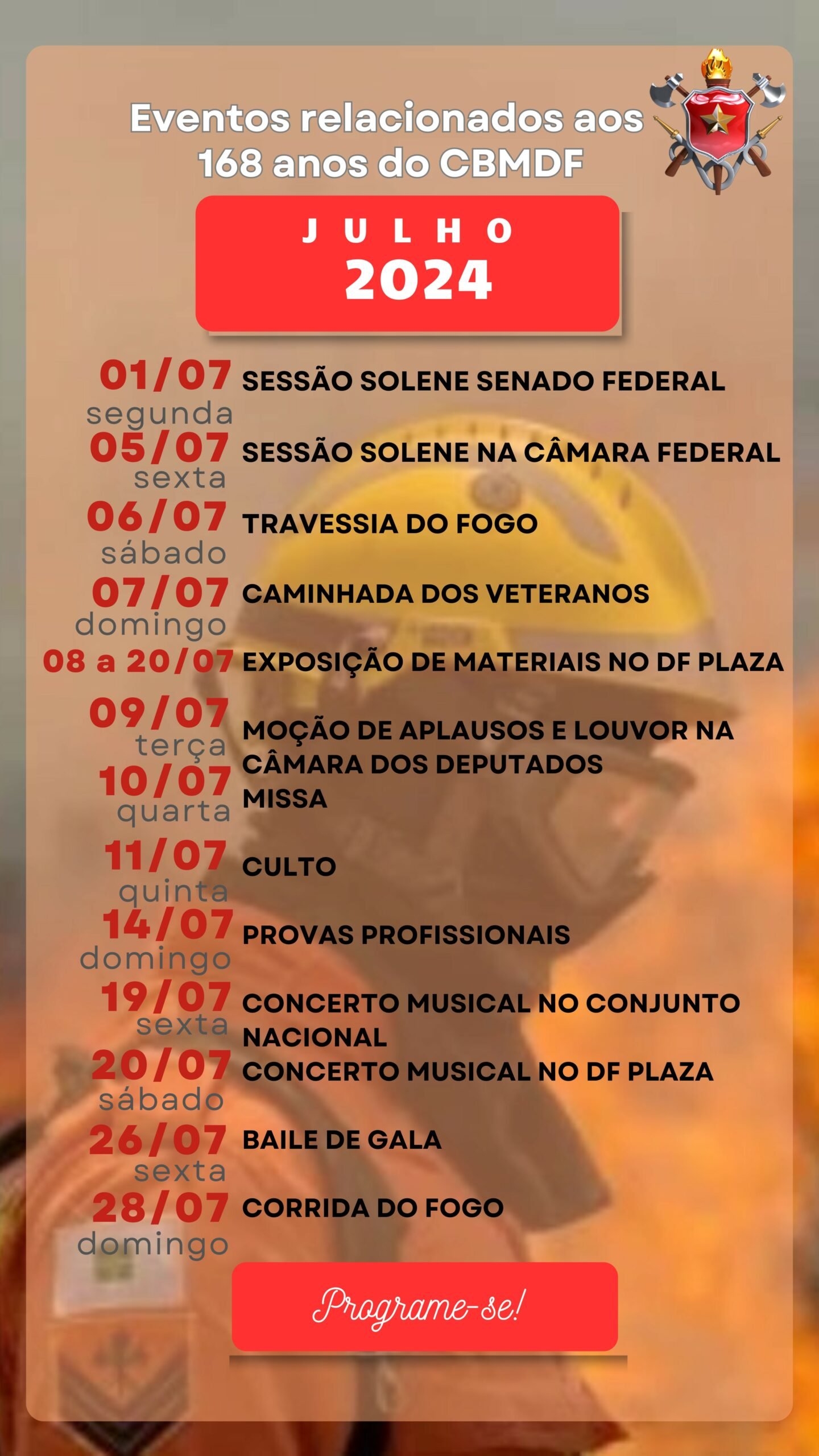 Calendário Julho 2024 – Eventos relacionados aos 168 anos do CBMDF – CBMDF