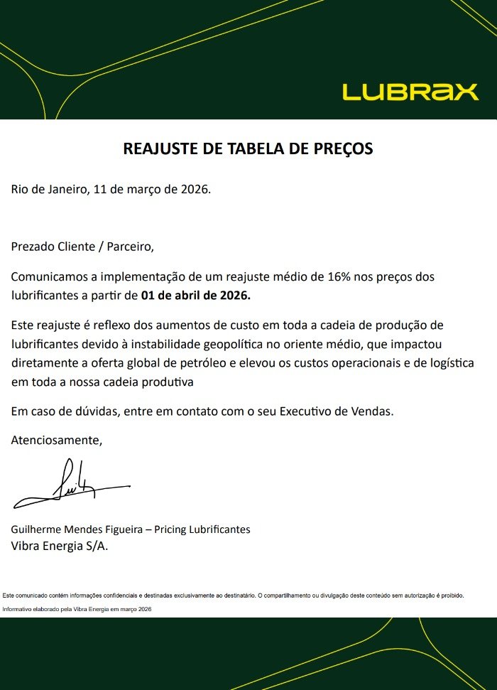 De acordo com o comunicado, o reajuste reflete “os aumentos de custo em toda a cadeia de produção de lubrificantes devido à instabilidade geopolítica no Oriente Médio, que impactou diretamente a oferta global de petróleo e elevou os custos operacionais e de logística”.