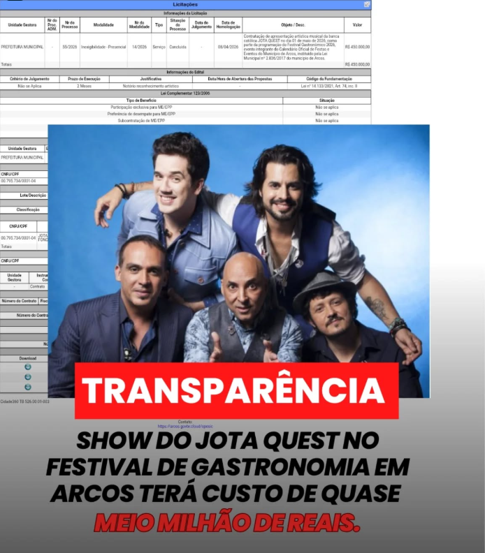 Um documento oficial de licitação revela: o show da banda Jota Quest, previsto para o Festival de Gastronomia, terá custo de aproximadamente R$ 450 mil aos cofres públicos.